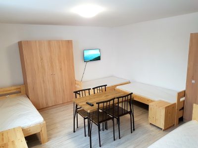 1 RD–tri 3-lôžkové izby,spoločná 2x sprcha, 2x WC a 1x pisoár. Každá izba je vybavená TV – SAT, WIFI, skriňami, nočnými stolíkmi, stolom a 3 stoličkami. Spoločná plne vybavená kuchyňa s chladničkou, sklokeramickou doskou, mikrovnou rúrou.