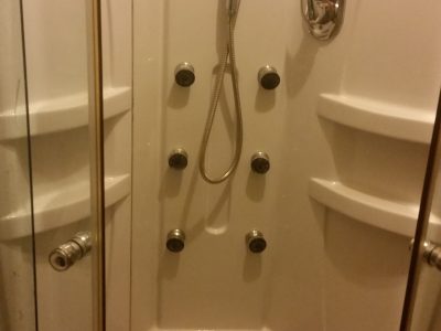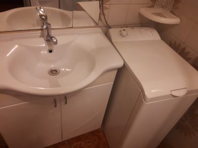 V kúpelni je umývadlo, masážný sprchový kút, automatická pračka, wc.